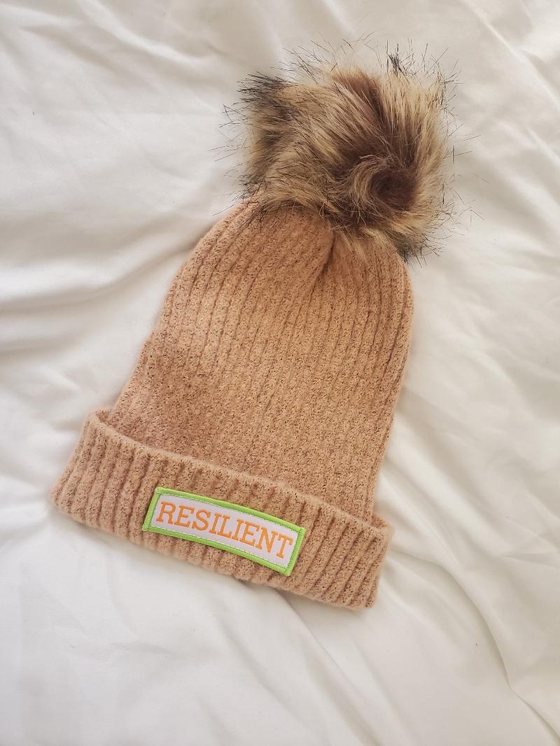 Our Resilient Grace Beanie is pink and comes in one size. It has a white rectangle patch with RESILIENT written in orange and a lime green outline.